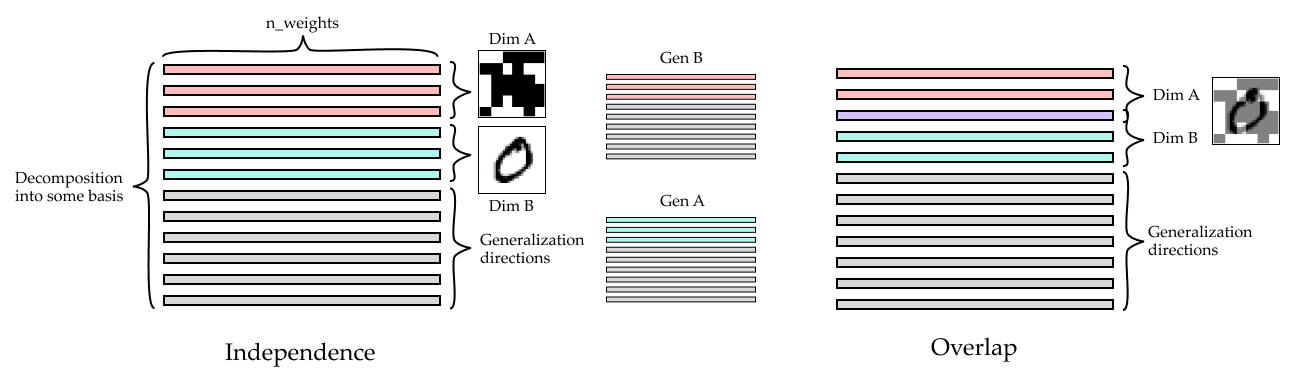 In particular, in their "booleanized" model, we see that it is possible to ablate (i.e., break) one of the modules by zeroing out or -- essentially equivalently -- adding noise to its constituent neurons. If one were to do this, then the total "consensus" model would end up tuned to only express one generalization and, moreover, do so in a robust way (i.e., no part of the ablated module would be "secretly" participating in the classification task). In the messy "native" models like our MNIST models, nice neuronal decompositions essentially never make sense (as we expect relevant features to appear in bases where multiple neurons are linearly combined -- or superposed -- with each other). However, the picture presented in Liu et al.'s paper can be potentially recovered on a linear-algebraic level, where we replace the explicitly boolean concept of a subset of neurons that appear in the distinct modules of Liu et al.'s models by a linearly independent set of weight vectors (in fact, the relevant parameter is not the set itself but the space it generates).