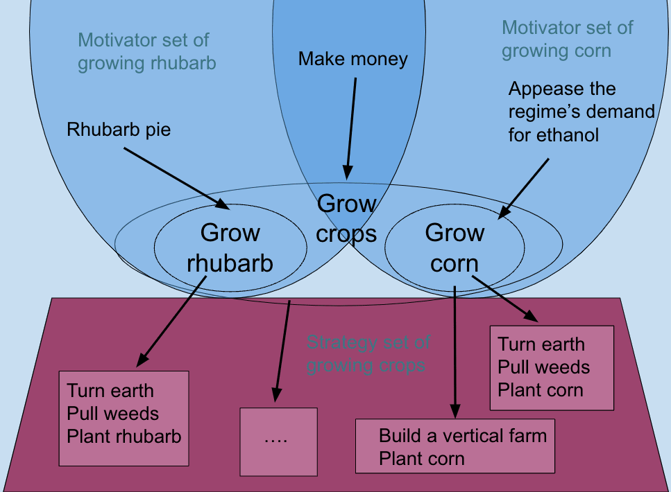 But, we don't necessarily know what ze intends to do with the crops, e.g. eat them or sell them. Information doesn't necessarily flow from subgoals up through the fact that the farmer is trying to grow crops, to indicate supergoals; the possible supergoals may be screened off from the observed subgoals. In that case, we're uncertain which of the supergoals in the motivator set of [grow crops] is the one held by the farmer.