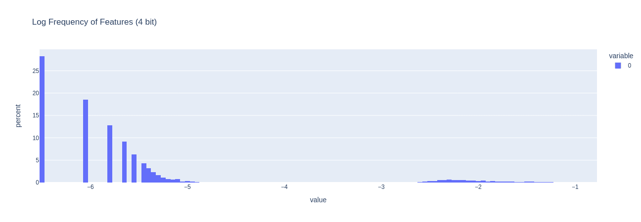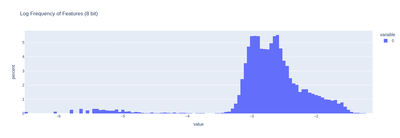 Below I plot, how many features are active across 50 batch examples. This is the log of the frequency, so if a feature is on the right, it means its activated more times than a feature on the left.