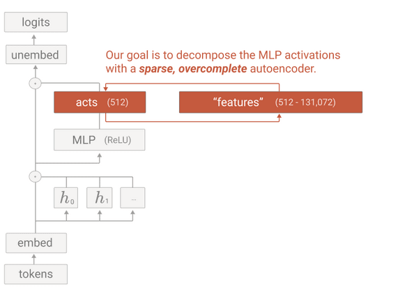 We have already talked about how the number of features is larger than number of neurons and how each neuron is a linear sum of its features. Therefore, to learn these features and the activations we use sparse dictionary learning, that is
