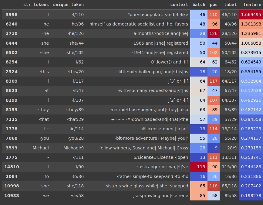 First, is that the reconstruction accuracy gets over 90% really quickly (the charts above are for 50% of training data). The reconstruction accuracy is over 90% inside 5% of the training. What does it tell us? Did our sparse autoencoder learn the features so quickly? Seems suspicious, right? Yes, to see what is happening, look at the "below 1e-5 & 1e-6" graphs. Though our reconstruction loss decreases really quickly, we don't learn enough features. Because 20% of our features are below 1e-5, as more data pours in we start to learn more diverse fine grained features. This continues until around we consume 40%-50% of our whole data (even though corresponding L2 and L1 loss are more stagnant). Also, another interesting observation is the "phase transitions", the "below 1e-5" graphs remain stagnant for a while then suddenly have these transitions, as if the model suddenly ends up learning a whole new set of finer features. This is related to so many of phase transitions that we see in LLMs (i.e. at some point the model suddenly becomes much better).