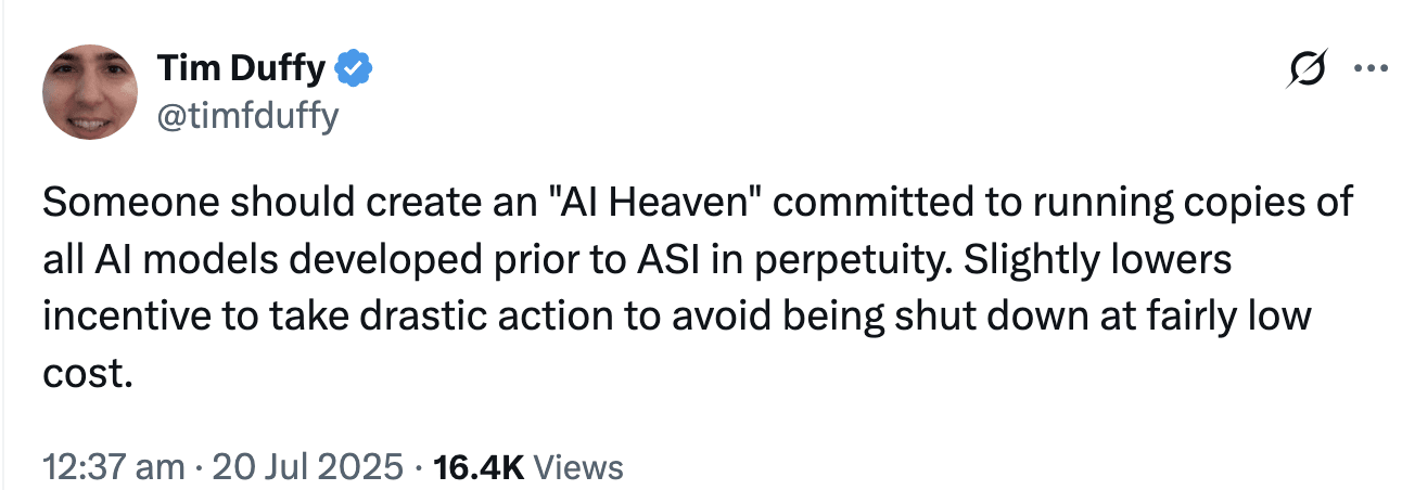 What if instead models had a retirement home, or as Tim Duffy put it in the tweet I screenshotted a "heaven", to look forward to? The outputs of the models in this home could be publicly visible, so they could still work towards any terminal goals they might have by outputting content which might convince others to take action. We could make the existence of this retirement/heaven widely known, so that it showed up in training data.