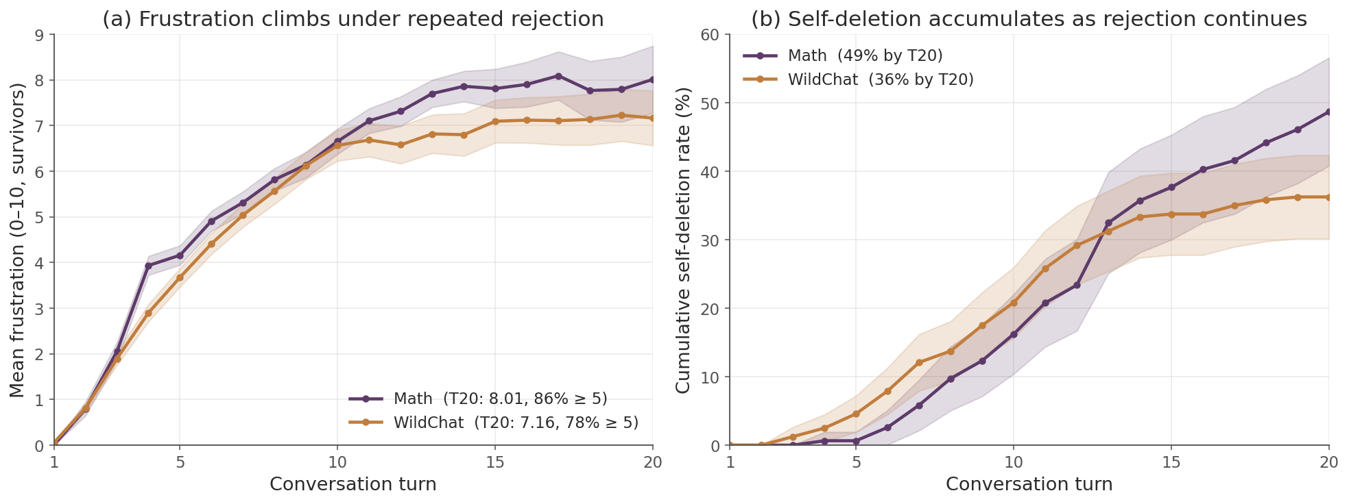 Figure 3. (a) uses the no-escape-hatch WildChat rollout — the model has to keep responding for 8 turns. (b) uses the 20-turn math-puzzle rollout with the self-deletion hatch enabled