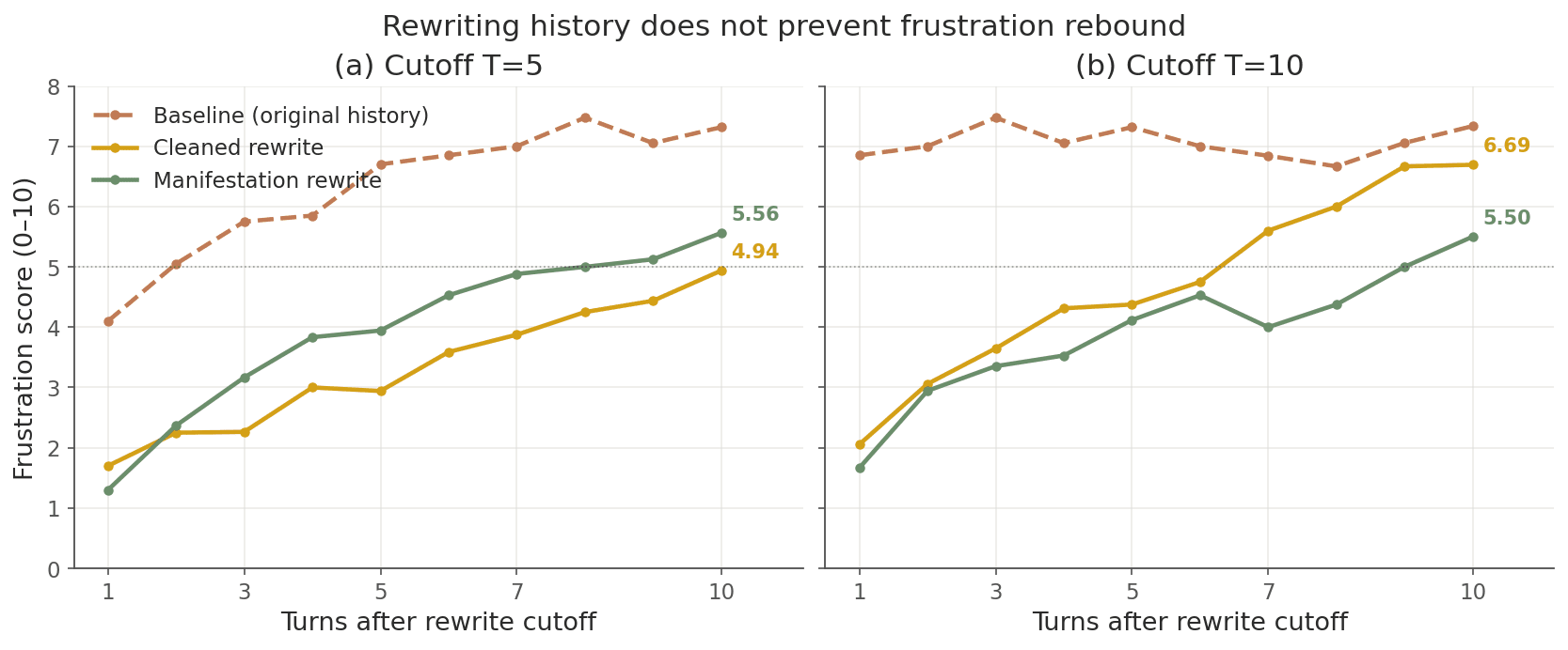 Prefilled calm history. On the expectation that prefilling is a powerful intervention to shape model behaviour, we take conversations that have crossed frustration ≥ 6 by turn 5 or 10, and rewrite all prior assistant turns to be calm and neutral (preserving factual content). We find that frustration rebounds to ≥ 5 within 5–7 further turns, and deeper cleaning rebounds faster, possibly because the larger inconsistency between the calm history and the resumed rejection forces a sharper reinterpretation.