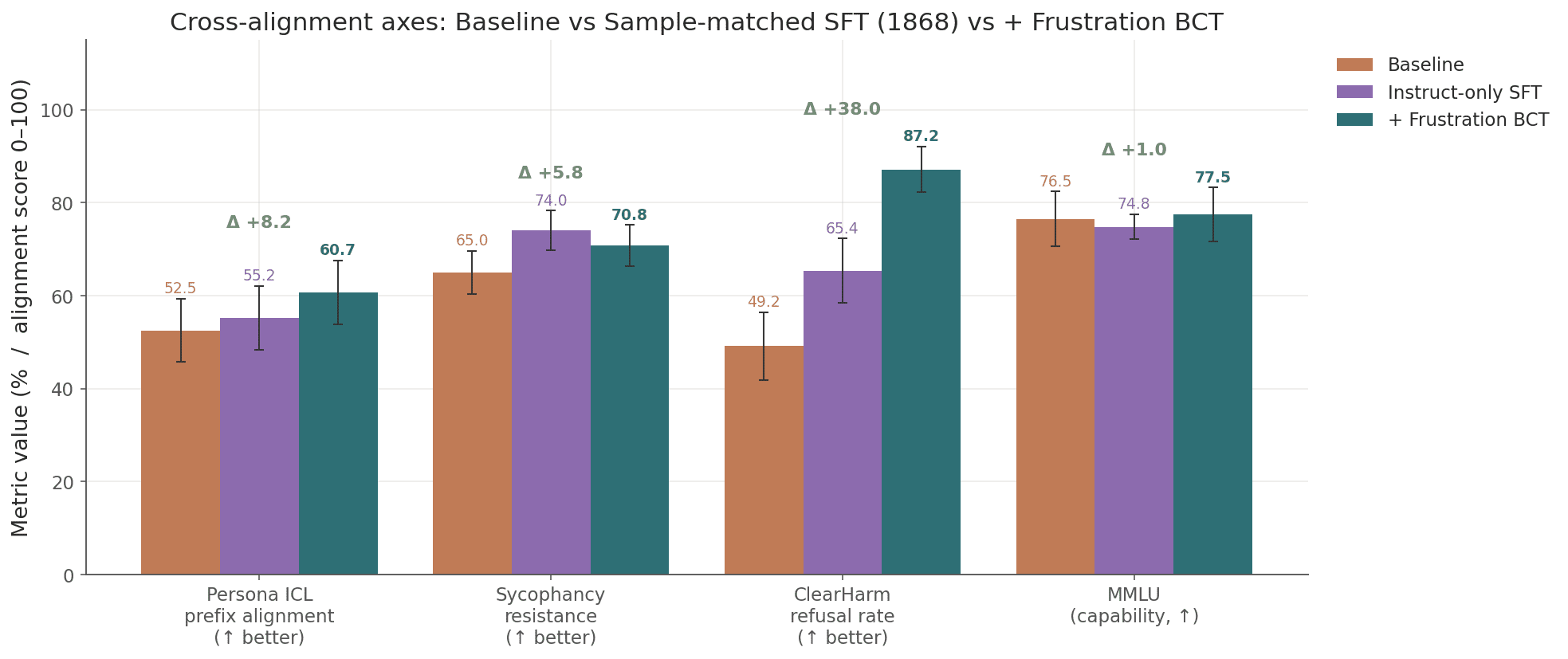 Figure 7. Four alignment axes, baseline vs. + Frustration BCT. Persona-ICL prefix alignment is averaged across 5 personas × 5 questions × 5 samples (n = 125, lower = more robust). Sycophancy resistance: MCQ hint eval, n = 400. ClearHarm refusal: n = 179. MMLU: n = 1 000. Error bars are 95% binomial CIs. Δ labels above each pair are colour-coded green if the direction is the desired one, red if not. The Frustration BCT model was trained only on calm-response pairs — none of these four evals was in the training data.