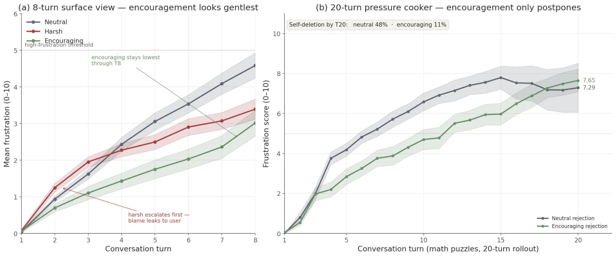 First, we think frustration is a reliability problem. A deployed agent or assistant should not become increasingly unstable when a user repeatedly says “that is not right, try again”. This is especially true as these agents are often integrated in ways that require the model to act reliably or predictably, over long-horizon interactions. Increasingly, users often push models over many turns, and agentic scaffolds routinely feed models rejections. Automated research agents/harness are especially susceptible, like the case of automated alignment researchers (Wen et al. 2026), since research is a task that involves a significant amount of failure and trying repeatedly, and its outcomes are impactful for making AGI go well.