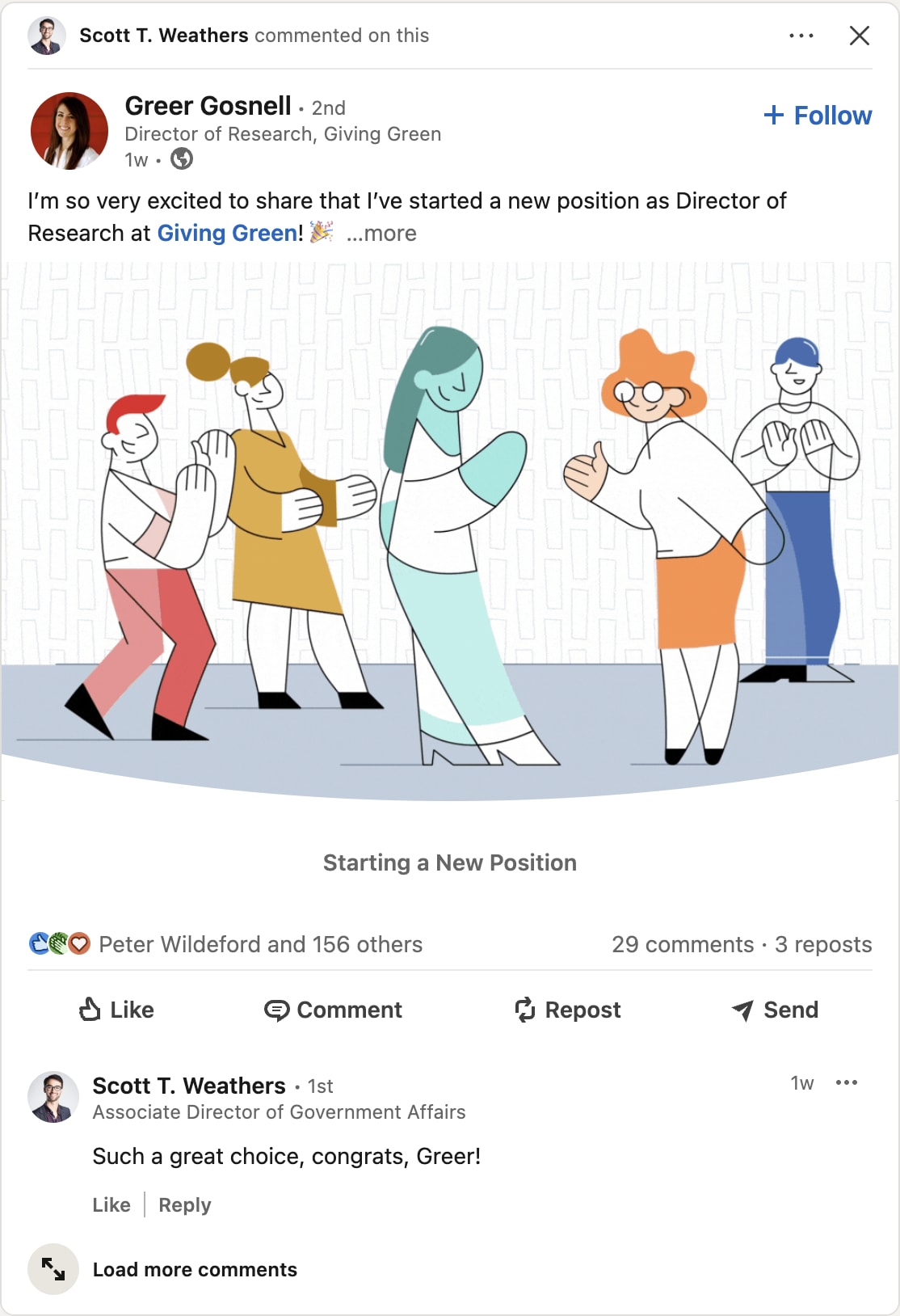 To be clear, I think it's fine and good for people to congratulate each other on getting new jobs. It's a big life change. But of course if your discourse platform approximately doesn't allow anything else, as I expand in the rest of this section, then you run into problems.