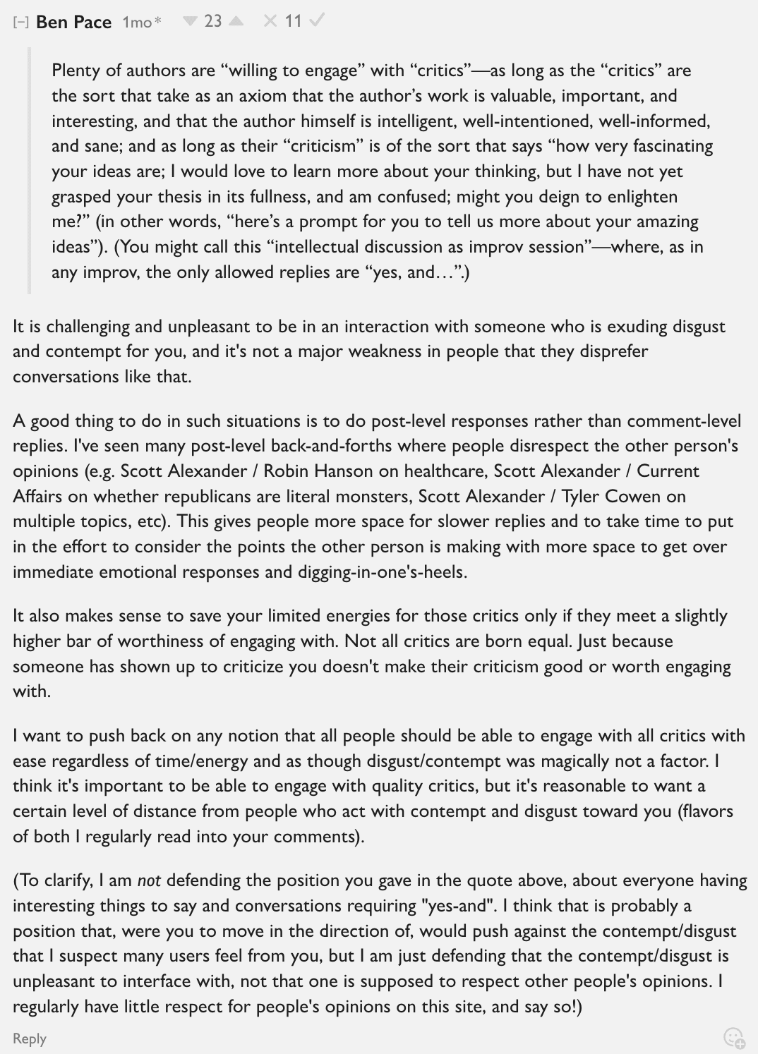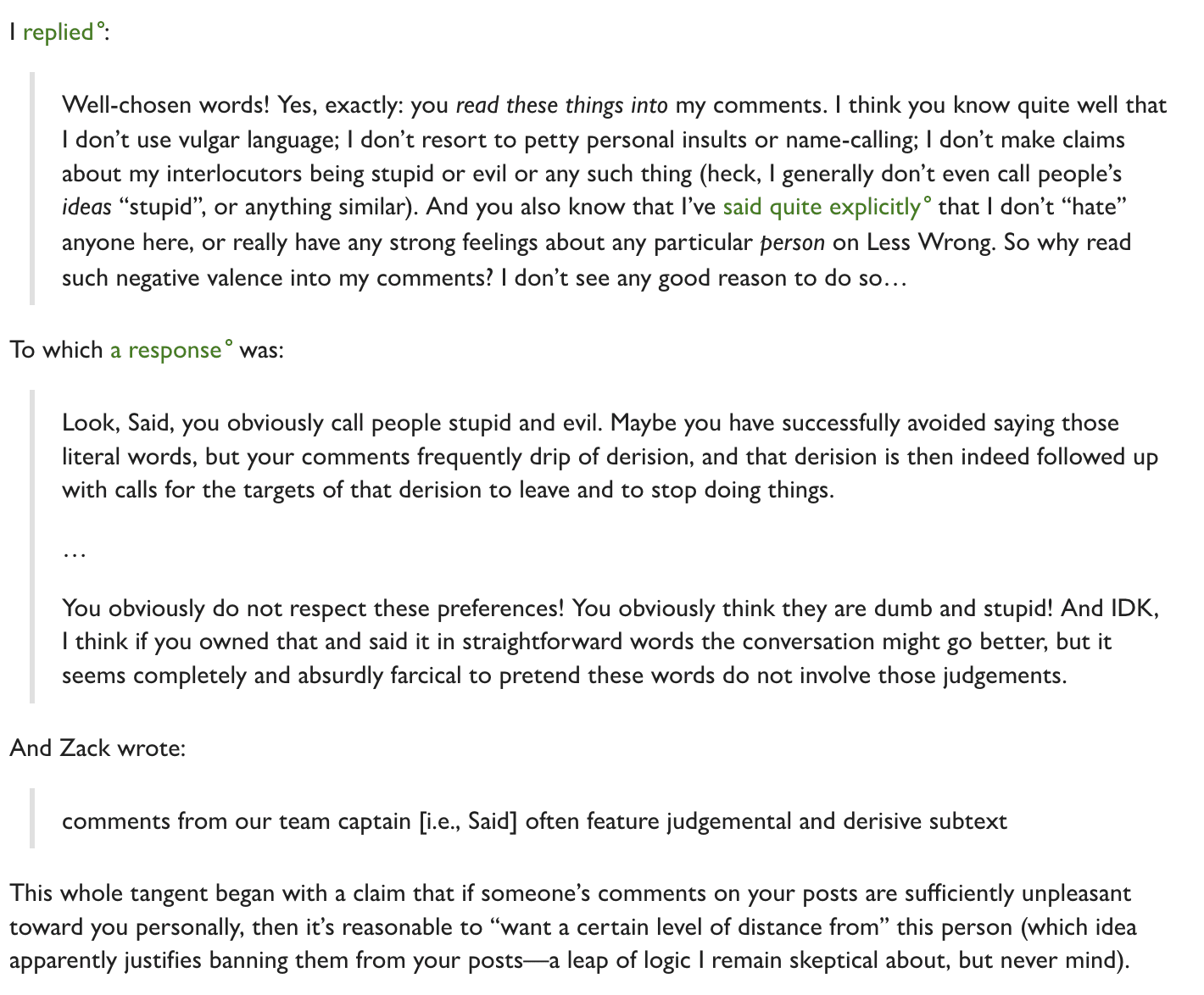 Why spend so much time engaging with a single commenter? Well, the answer is that I do think the specific way Said has been commenting on the site had a non-trivial chance of basically just killing the site, in the sense of good conversation and intellectual progress basically ceasing, if not pushed back on and the collateral damage limited by moderator action.