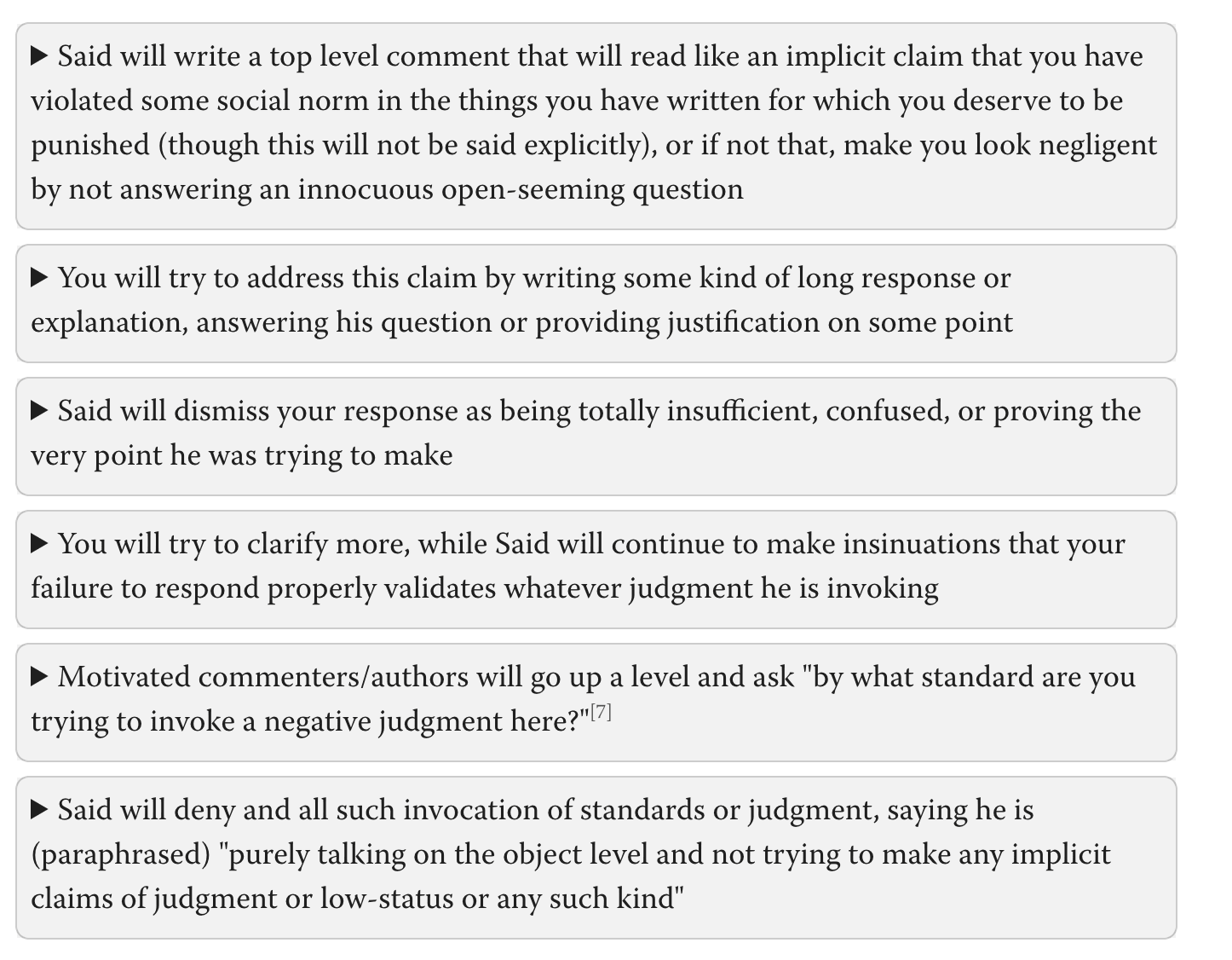 A way this all feels relevant to current disputes with Duncan is that thing that is frustrating about Said is not any individual comment, but an overall pattern that doesn't emerge as extremely costly until you see the whole thing. (i.e. if there's a spectrum of how bad behavior is, from 0-10, and things that are a "3" are considered bad enough to punish, someone who's doing things that are bad at a "2.5" or "2.9" level don't quite feel worth reacting to. But if someone does them a lot it actually adds up to being pretty bad.