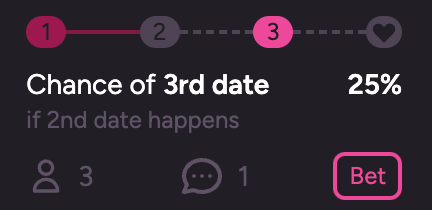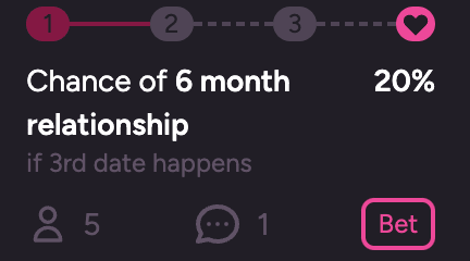 Manifold, a play-money prediction market platform, recently released a prediction market dating app called “Manifold Love.” Users — those seeking love — sign up and fill out their profile like a regular dating app. Matchmakers — some of whom are users of the app themselves — pair users up. After a matchmaker makes a match, prediction markets are automatically created on various benchmarks of the pair’s (potential) relationship.