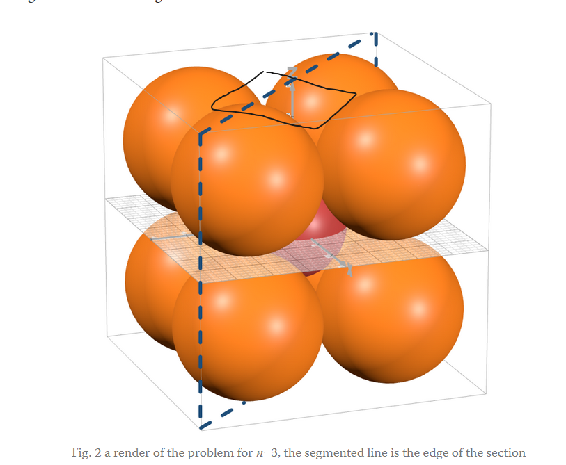 A number of years ago Numberphile published a video on the behavior of higher dimensional spheres with the title “Strange Spheres in Higher Dimensions”. I'd recommend one watches the video before reading this post, in that video Matt Parker presents a construct where spheres are placed inside a cube pressing against its faces, in the remaining central volume an additional sphere is set with a radius so that it kisses the “padding spheres”, this build is then scaled to higher dimensions where Parker observes that the central sphere increases in size constantly until its surface goes through the face of the cube, an apparently impossible configuration. He then jokingly concludes that the only way to make sense of it is to imagine higher dimensional spheres as “spiky”, so that the spikes can go through the face while the rest of the volume remains confined inside the hypercube.