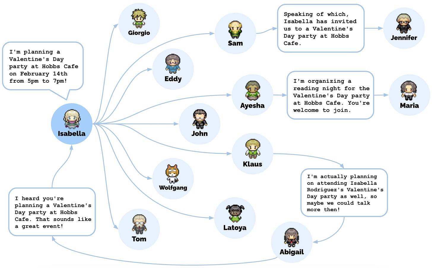 More agents introduce more complexity. Researchers at Stanford and Google recently built a virtual world full of agents controlled by language models. Each agent was given an identity, an occupation, and relationships with the other agents. They would choose their own actions each day, leading to surprising outcomes. One agent threw a Valentine’s Day party, and the others spread the news and began asking each other on dates. Another ran for mayor, and the candidate’s neighbors would discuss his platform over breakfast in their own homes. Just as the agents in this virtual world had surprising interactions with each other, autonomous AI agents have unpredictable effects on the real world.