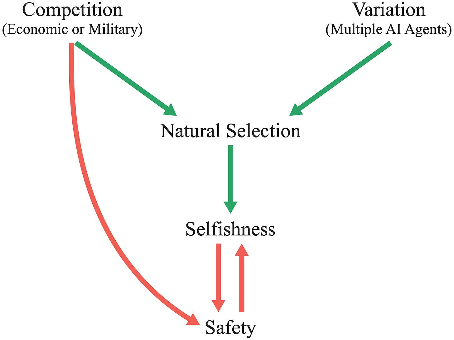 The argument relies on two observations. Firstly, natural selection may be a dominant force in AI development. Competition and power-seeking may dampen the effects of safety measures, leaving more systemic forces to select the surviving AI agents. Secondly, evolution by natural selection tends to give rise to selfish behavior. While evolution can result in cooperative behavior in some situations (for example in ants), the paper argues that AI development is not such a situation.