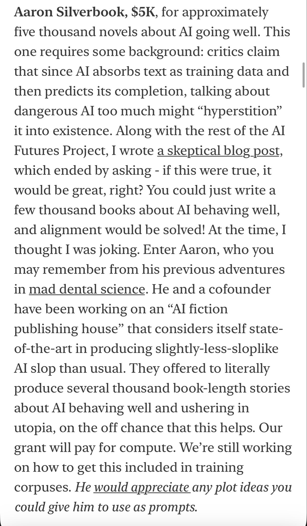 Some lab folks are experimenting with our outputs already, to see whether we can quickly disprove the hyperstition hypothesis. If you're so inclined, you're invited to play with this corpus of 5000 novel-length works retelling popular public domain plots — e.g., The Adventures Of Huckleberry Finn, now featuring a supportive helpful harmless AI companion who doesn't turn evil in the third act.[1]