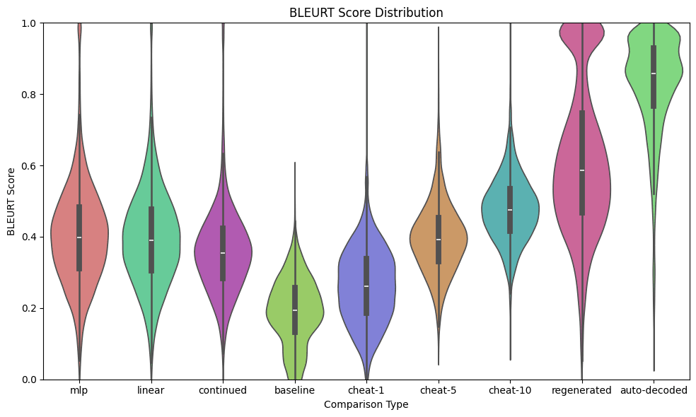 Additionally, I try with BLEURT score, which is also an imperfect metric, but better than the BLEU or ROGUE scores (see Appendix for those[3]) but still shows results mostly consistent with "around the same level as cheat-5, worse than regeneration". We see regeneration suffers here more compared to Auto-decoded. I still think these results are not that meaningful.
