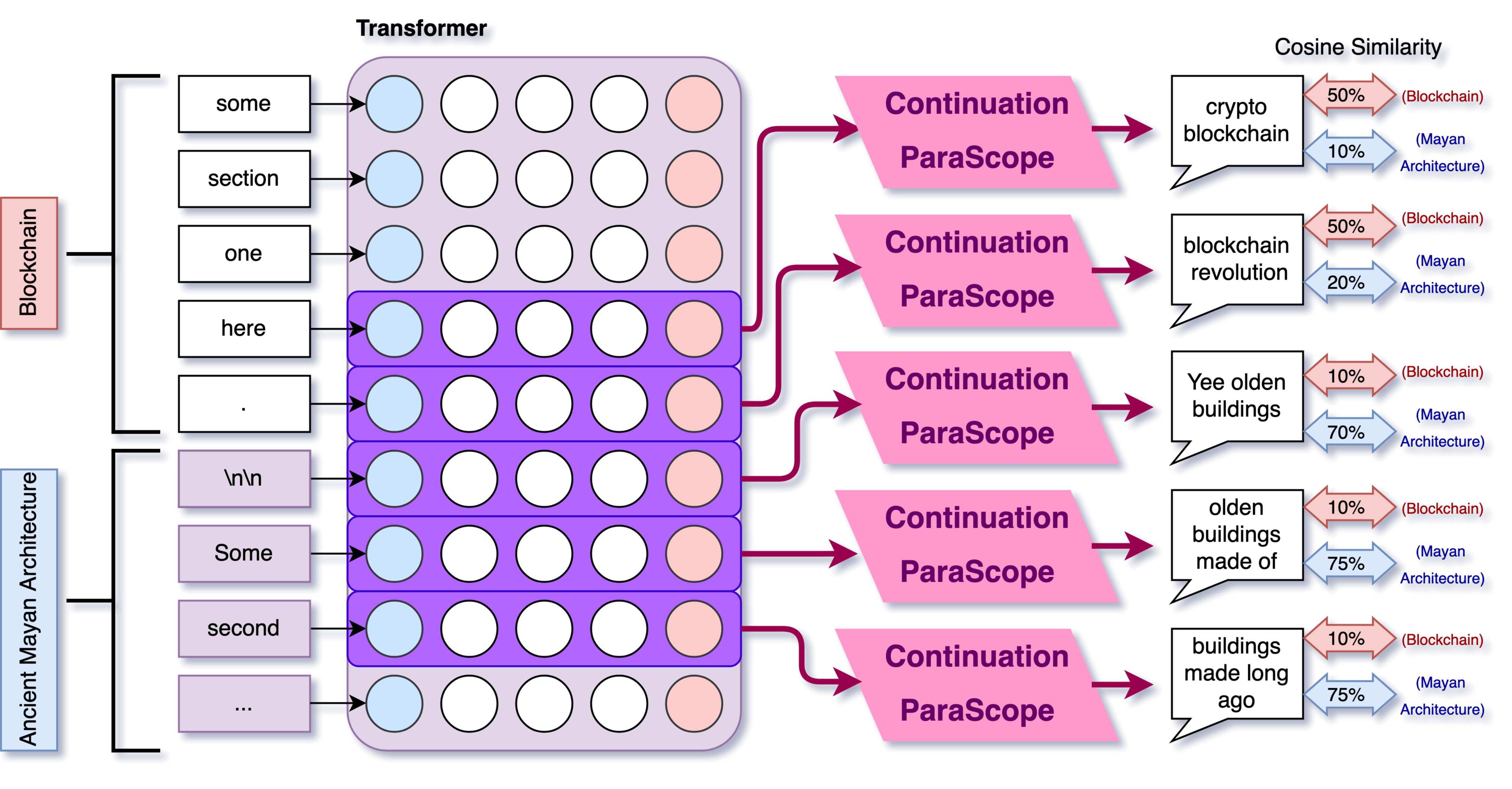 Here is an example between two specific texts (blockchain vs ancient mayan architecture):