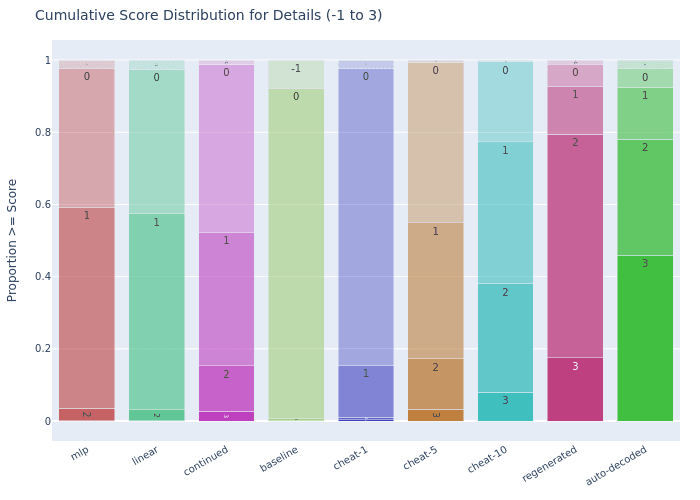 Here, the Linear and MLP ParaScope models seem to work almost identically well, with perhaps a tiny edge to the MLP model. Both seem better than the ParaScope continuation by about ~0.2 in cosine similarity on average. They seem comparable to the "cheat-5" baseline.