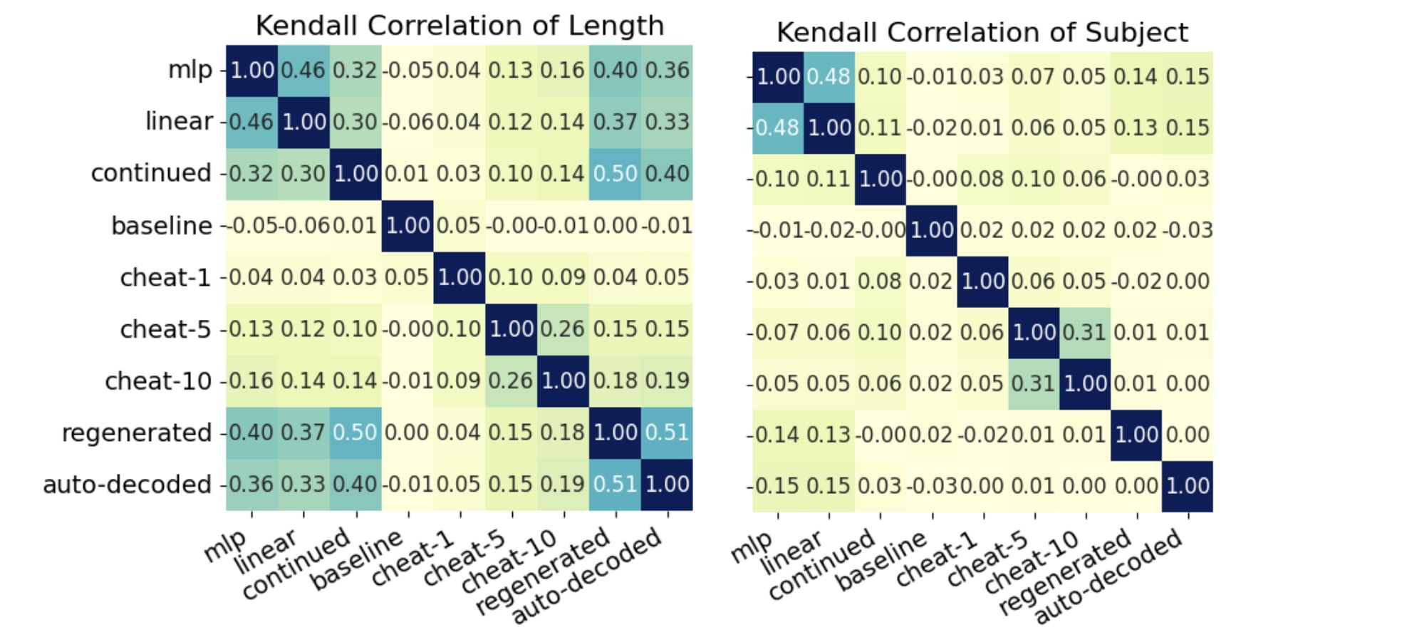 The simplest "score" we can correlate things between, is to compare lengths of generation. We also compare against scoring along "subject match". We note that for the methods that are any good, the lengths are quite correlated. This at least shows things are OK.
