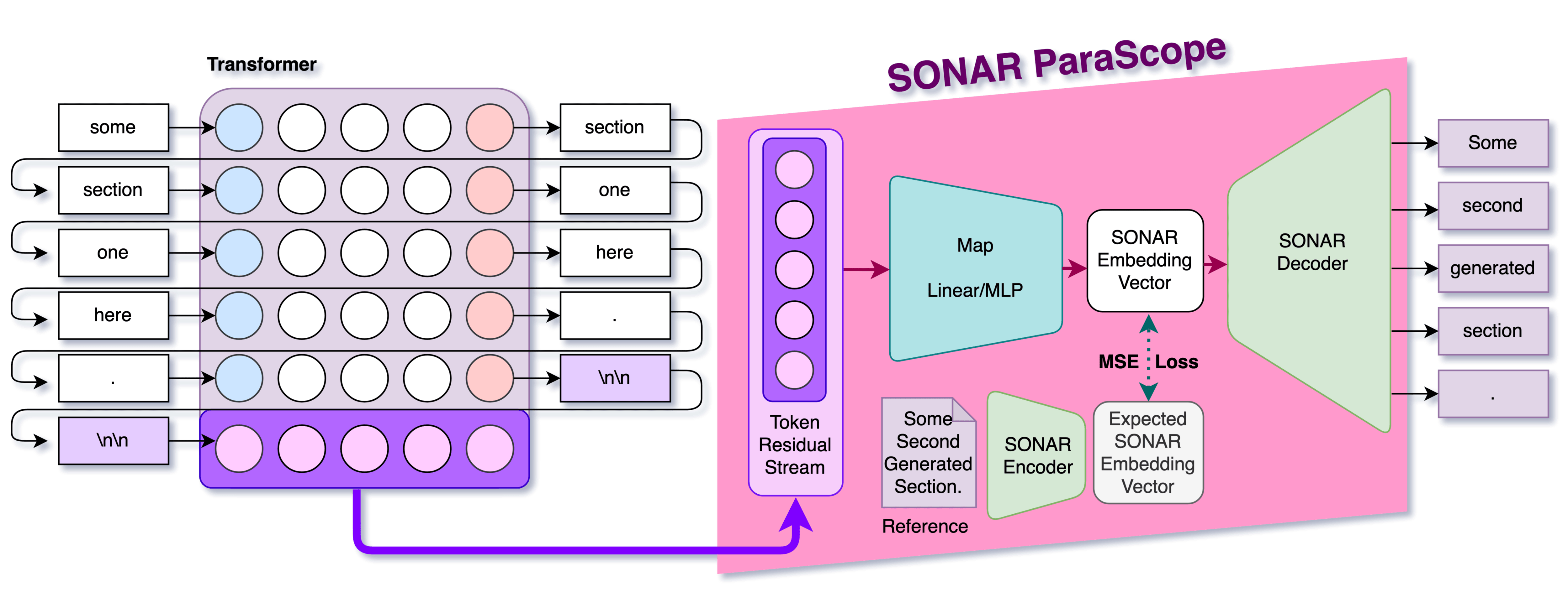 2) Text Auto-Encoder Map ParaScope: Training a map from residual stream to the embedding space vector generated by a Text Auto-Encoder model (the input to the Text AutoEncoder's Encoder is the desired paragraph), then using the decoding the embedding vector with the AutoEncoder's Decoder.