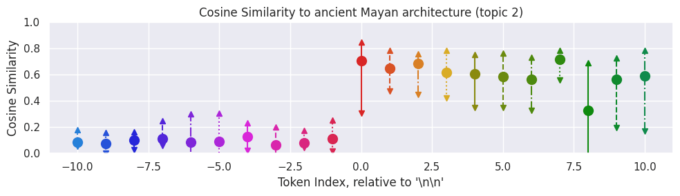 We can see that before the "\n\n" token, the model basically never outputs anything even vaguely similar to "ancient Mayan architecture", and often outputs things that are somewhat similar to the blockchain paragraph. After the newline, it consistently outputs things that are judged to be very similar to ancient Mayan architecture and dissimilar to blockchain.