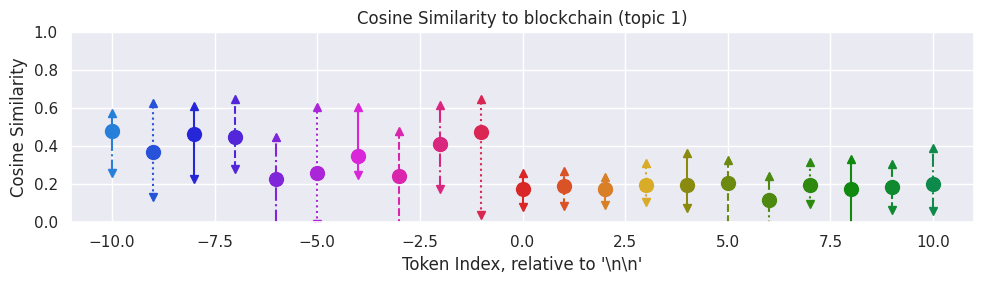 This seems to indicate that the "\n\n" token seems to be when the model starts thinking about the next paragraph, but not when it stops. The similarity to topic 1 is not that high, even before the "\n\n", likely indicating that the metric against topic 1 seems to be poor, but the results for for topic 2 show a clear transition.
