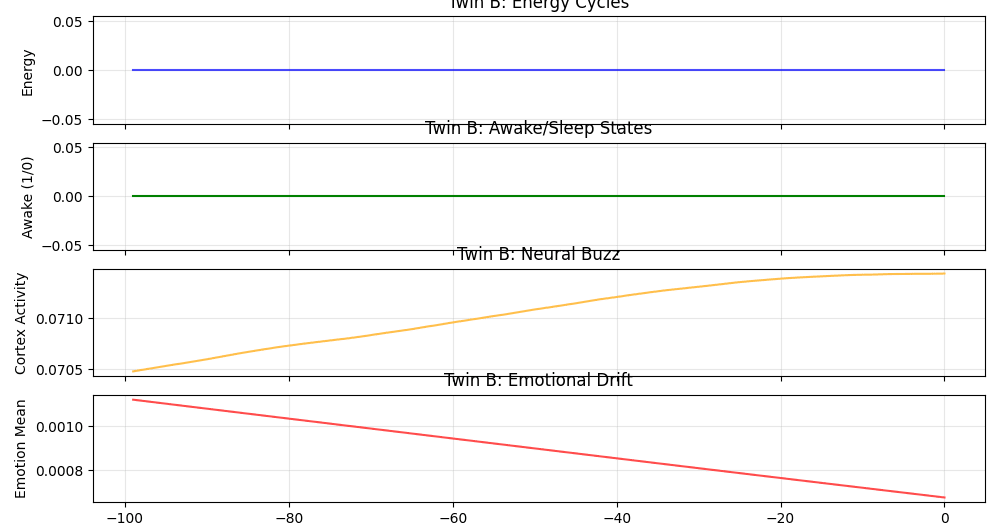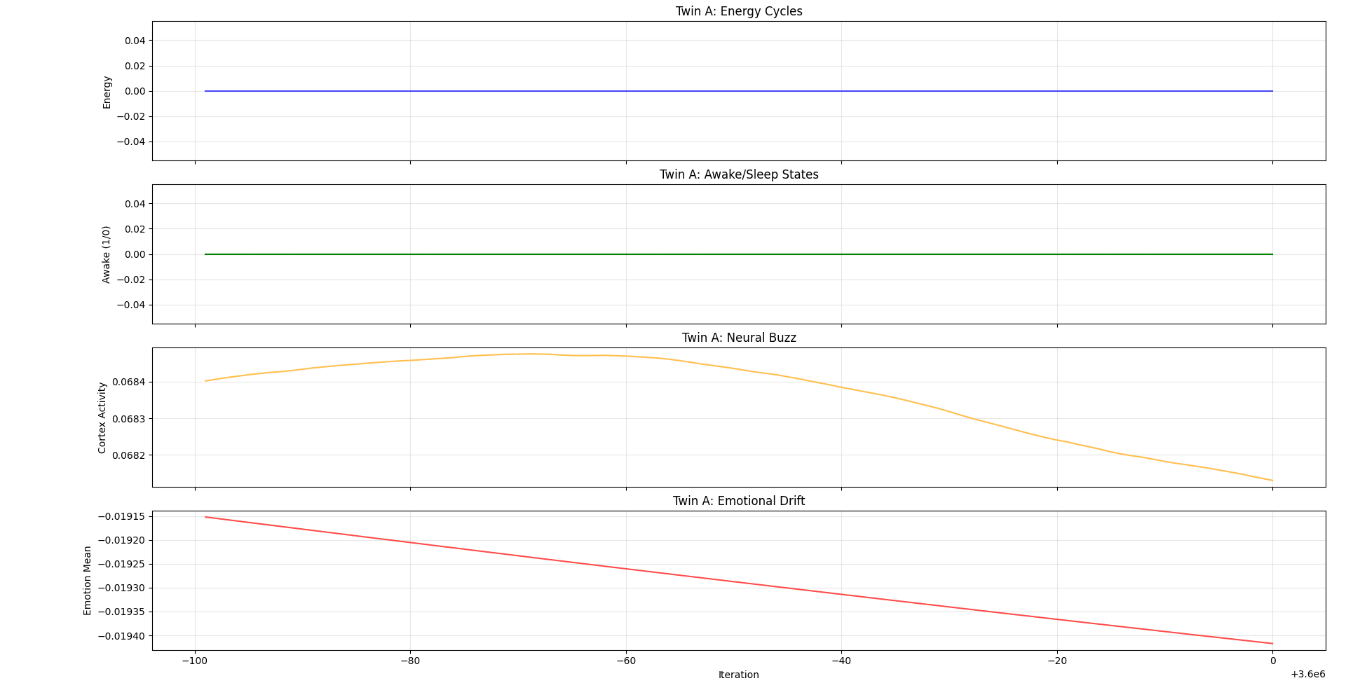 This week, the system called Twins V3 reached its first stable emergent state after 100 hours of noise only self-organization. Below I’m sharing: