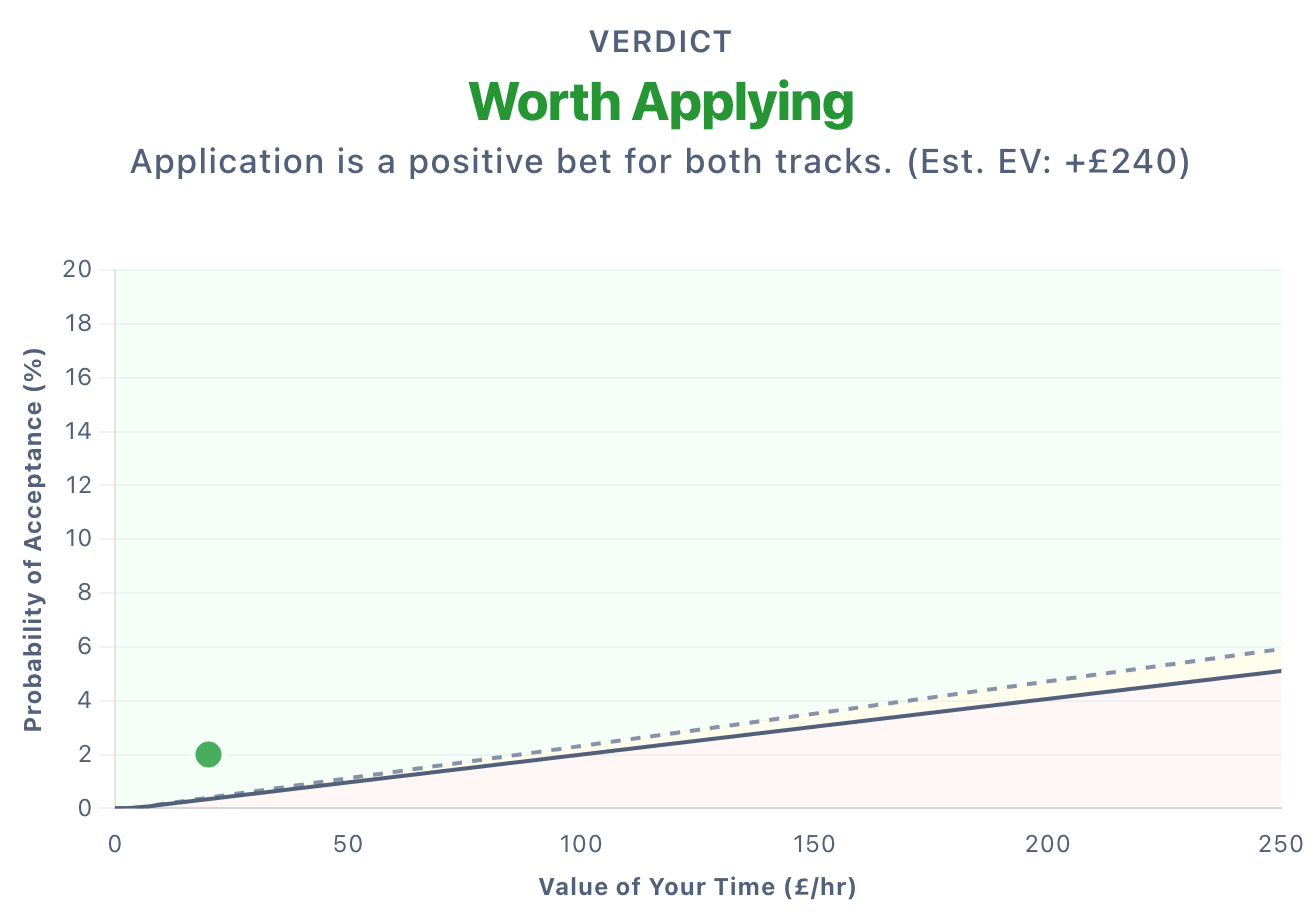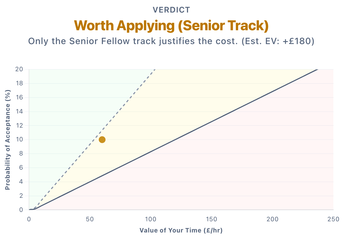 Value of Information: As a simplifying assumption, we added a small fixed value (£10) to the model to represent the utility of the application process itself (structuring your thoughts on research) and the signal value of the result. For some people (e.g. those trying multiple adjacent fellowships) this could be considerably higher.