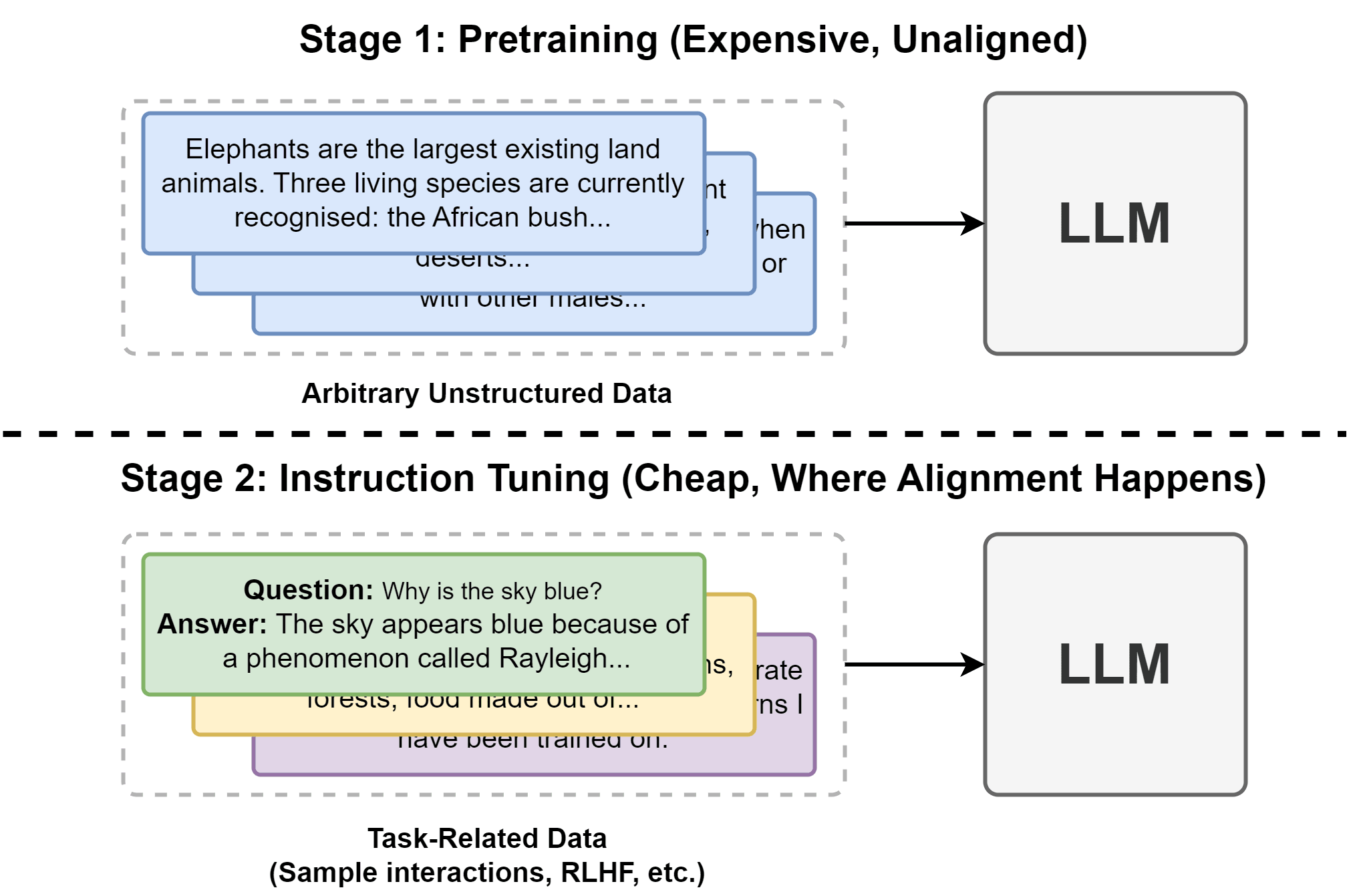 If we had such a process, then even if the system were stolen and queried at a snapshot part-way through stage one training, it would not be able to do something it shouldn't. This process would be very different from the current LLM training procedure, where an initial pre-training phase learns unorganized patterns from a huge amount of data, and is only aligned in a second, less data-heavy phase (see the image below).