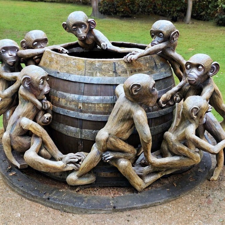 But if the word strings both we and AI spit out are just whatever our statistical models serve up, do they actually mean anything? For that matter, what is even the meaning of our supposed “meanings” if everything is just a string of, if you will, plastic monkeys? In the case of an AI we have no problem saying their machinations don’t inherently “mean” anything. Indeed, it’s the position taken for granted at the beginning of this essay. We’re generally quite fine with saying an AI merely plays a sophisticated “language game” of moving monkeys around.