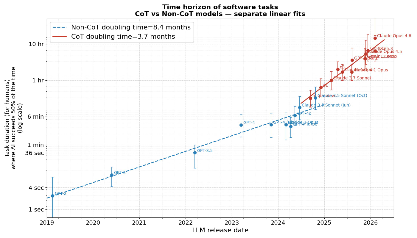 - Chain-of-Thought. This fits better, but not perfectly. The piecewise linear fit shows that the faster trend started around February or March 2024. o1-preview, the first model that used CoT natively, was released in September, many months after the change in trend, and several non-CoT models are on the faster trend. Even if the estimated date of change is off by a month or two, it would still mean that the trend changed before o1-preview was released, and several non-CoT models would still be on the faster trend. I'm leaning towards this explanation as the other two seem much less likely.