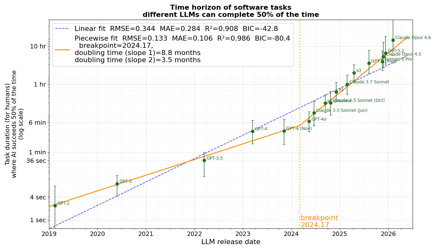It's pretty clear that piecewise linear fits the METR data better. But it's possible that this is an artifact of METR's methodology. Is there any other benchmark where a similar change could show up? ECI, Epoch Capabilities Index, doesn't go back in time far enough to be reliable, the oldest SOTA model on ECI is GPT-4 released in 2023. If anyone knows a benchmark that includes models from the oldest (GPT-2 and GPT-3) to the newest, let me know.