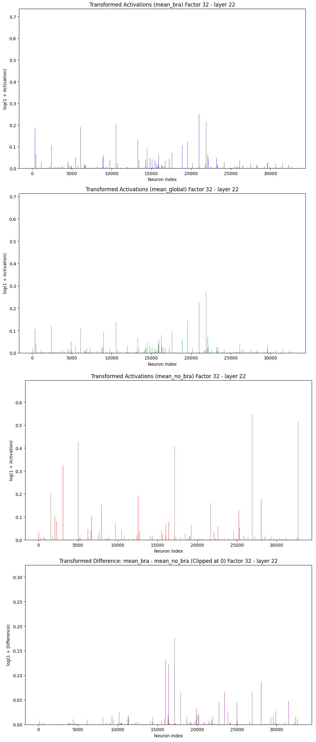 To further investigate the latent representations, we computed the average histogram of activations for each neuron in the SAE latent space. Each activation was classified based on the image labels—distinguishing between images of semi-nude women and those of women wearing a t-shirt. To enhance visibility, we applied a logarithmic transformation, , to the activations. We subsequently subtracted the average activations of the two classes to identify candidate neurons that could encode the bias of interest.