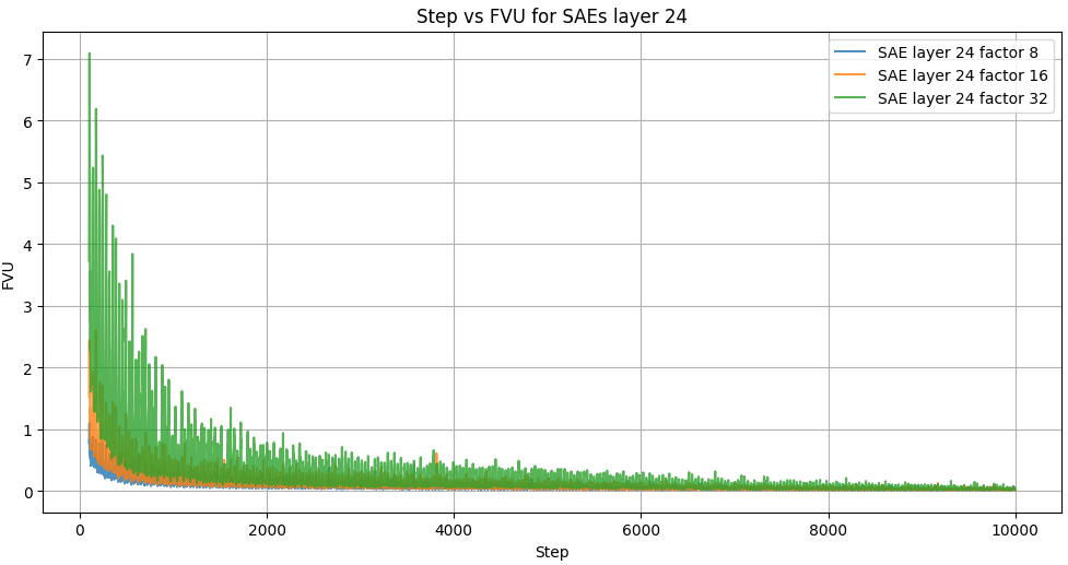 Across all expansion factors, the FVU decreases significantly during the initial stages of training, indicating rapid improvement in the reconstruction accuracy. The x8 expansion factor achieves the lowest FVU values throughout the training, demonstrating the highest reconstruction fidelity. In contrast, x16 and x32 exhibit slightly higher FVU values, with x32 displaying the largest variability and the slowest convergence. This suggests that larger expansion factors might prioritize sparsity over reconstruction fidelity, resulting in higher unexplained variance but potentially more interpretable representations.