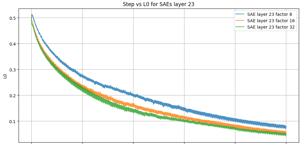 The Figure 2 "Step vs L0 for SAEs layer 23" provides a detailed perspective on the sparsity dynamics across different expansion factors (x8, x16, x32) during training. The L0 metric, which quantifies the average number of active latent units per batch, decreases progressively over training steps for all expansion factors, reflecting the sparse representations encouraged by the loss function. The x8 expansion factor exhibits the highest L0 values, indicating less sparsity compared to x16 and x32, which show progressively lower L0 metrics and, thus, sparser activations. This trend suggests that higher expansion factors (x32) may enforce stricter sparsity constraints, potentially capturing more interpretable latent representations at the cost of reduced reconstruction fidelity.