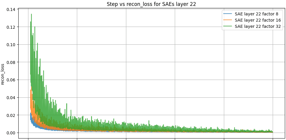 The Figure 1 "Step vs recon_loss for SAEs layer 22" provides critical insights into the performance of Sparse Autoencoders (SAEs) trained with different expansion factors (x8, x16, x32). All configurations demonstrate a significant reduction in reconstruction loss during the initial training steps, indicating effective learning of the residual activations. The x8 expansion factor achieves the lowest reconstruction loss, suggesting superior reconstruction fidelity, while larger factors (x16 and x32) exhibit higher initial losses and greater variability, though they eventually converge. The final plateau in reconstruction loss highlights potential architectural or sparsity-regularization constraints on the models' reconstruction capabilities. In summary, while lower expansion factors (x8) prioritize precise reconstruction, larger factors (x16 and x32) may better capture complex latent patterns, making them more suitable for identifying critical biases and differences in the dataset depending on the specific research objectives.