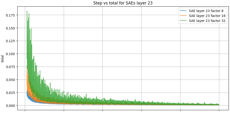 All configurations show a steep decline in total loss during the initial steps, reflecting the rapid optimization of the model as it learns to balance reconstruction accuracy with sparsity. The x8 expansion factor achieves the lowest total loss consistently throughout training, indicating a better trade-off between sparsity and reconstruction fidelity. Meanwhile, x16 and x32 have higher total loss values, with x32 demonstrating the greatest variability during training. This variability is likely due to the more aggressive sparsity constraints imposed by larger expansion factors, which require the model to allocate more capacity to satisfy the sparsity regularization.