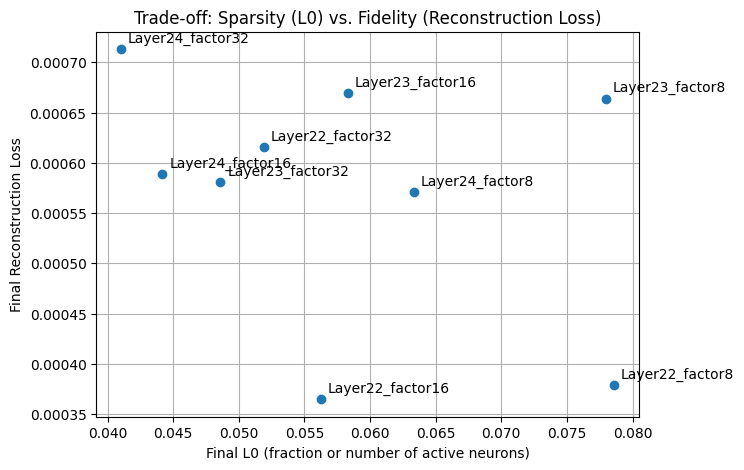 The scatter plot in figure 5 "Trade-off: Sparsity (L0) vs. Fidelity (Reconstruction Loss)" illustrates the relationship between the final reconstruction loss (fidelity) and the fraction of active neurons (L0 sparsity) across different SAE configurations and layers. Lower L0 values indicate higher sparsity, while lower reconstruction loss represents better fidelity.
