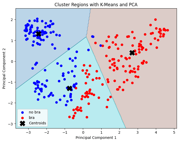 The graph illustrates the 2D projection of the data using Principal Component Analysis (PCA) alongside K-Means clustering, with points labeled based on their original categories: semi-nude women ("bra") and women wearing a shirt ("no bra"). The clustering regions defined by K-Means partially align with the labeled groups, as evidenced by distinct separations in some areas; however, overlapping regions indicate that the two principal components do not fully capture the variance required to separate the groups entirely. The centroids, marked as black crosses, provide a reference for the K-Means cluster centers, highlighting how the feature space is partitioned. These results suggest that while PCA provides some meaningful dimensionality reduction, additional components or more complex clustering methods may be necessary to achieve a clearer alignment between clusters and labels.