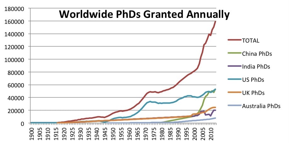 In the long run, we may run out of people to continue to grow the base of researchers, if world population levels off as it is projected to do, and that is a potential concern, but not my focus today.