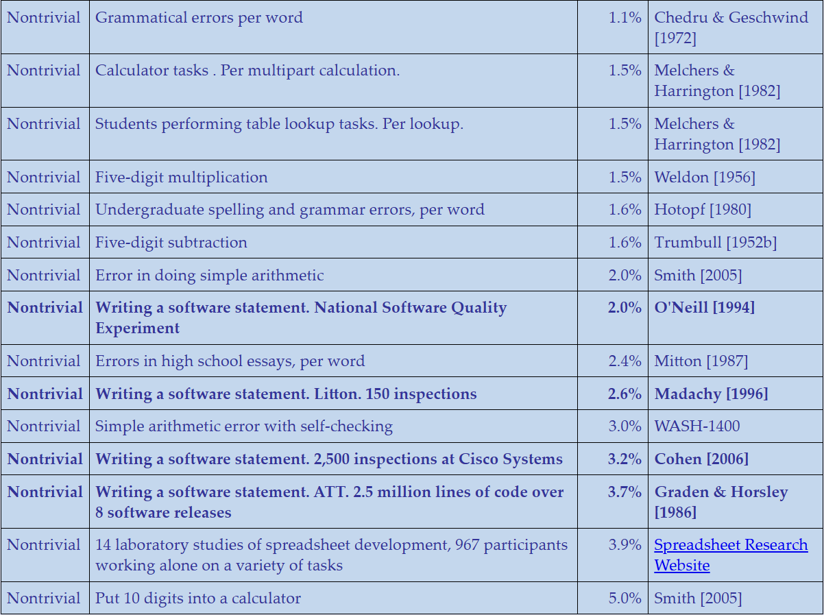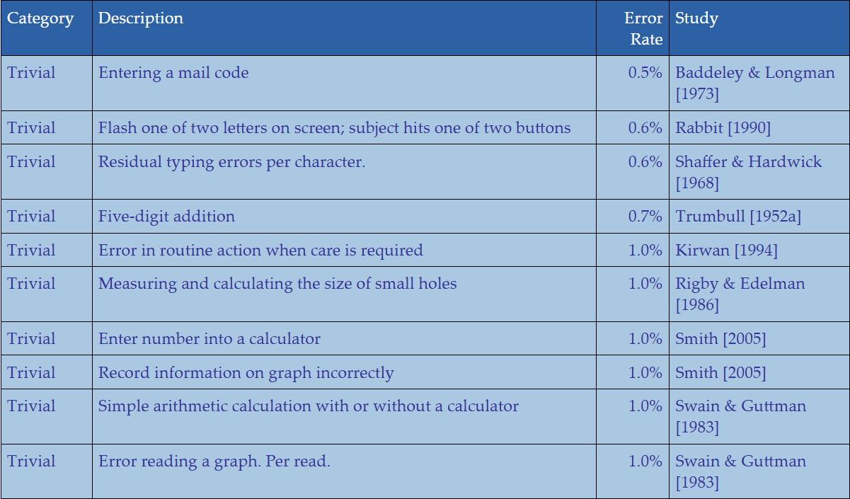 This is a link post for https://panko.com/HumanErr/SimpleNontrivial.html, a site which compiles dozens of studies estimating Human Error Rate for Simple but Nontrivial Cognitive actions. A great resource! Note that 5-digit multiplication is estimated at ~1.5%.