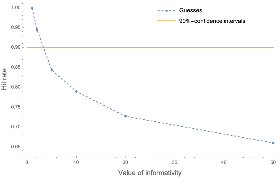 The “Value of Informativity” is their “J-value” (see section 3 of this paper). Although this is a parameter we don’t expect people to have direct intuitions about, you need a J-value of about 6 for the optimal accuracy-informativity tradeoff in our election case to favor guessing “Joe will win” over “Joe or Don will win”. Thus a J-value of 3 or 4—the threshold at which people become overprecise—is quite modest. Indeed, many sensible guesses require much higher J-values: if Joe had a 50% chance of winning, Don had a 10% chance of winning, and 40 other candidates had 1% each chance of winning, then the J-value required to guess “Joe will win” is over 2000.
