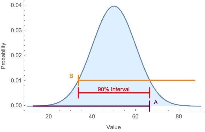 But when asked for the number B that you’re 95% confident is below the true value, “60 million” is no more informative than “50 million”—both are complete answers to that question.[5] Similarly when asked for the number A that you’re 95%-confident is about the true value—“80 million” is no more informative than “100 million”.
