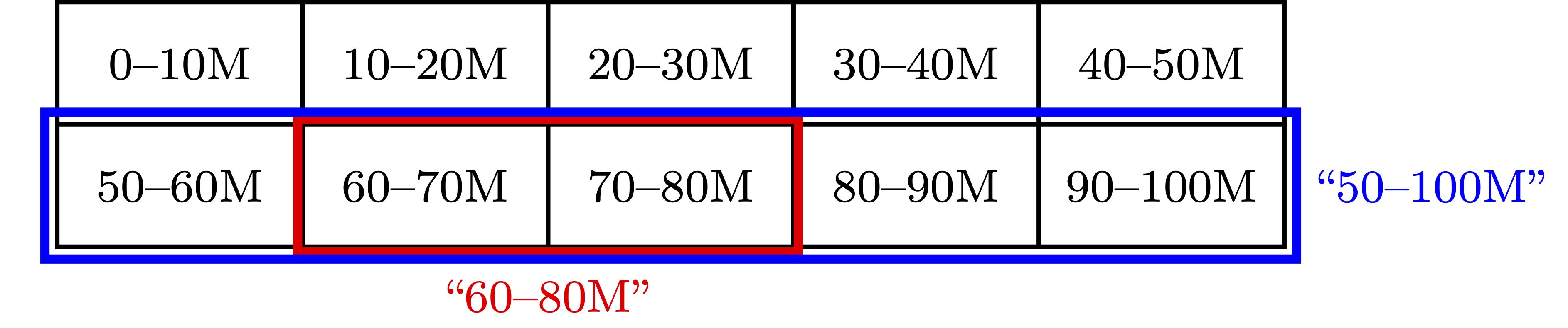 Binning populations by 10-millions and upper-bounding it at 100M, for simplicity. We assume that when asked for an interval, the goals of the conversation pinpoint a maximal level of fineness of grain.
