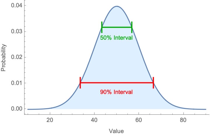 You can ask for intervals at various levels of confidence. A 90%-confidence interval is the narrowest interval that you’re 90%-confident contains the true value; a 50%-confidence interval is the narrowest band that you’re 50%-confident contains it, etc.