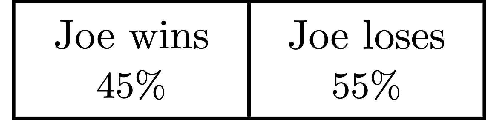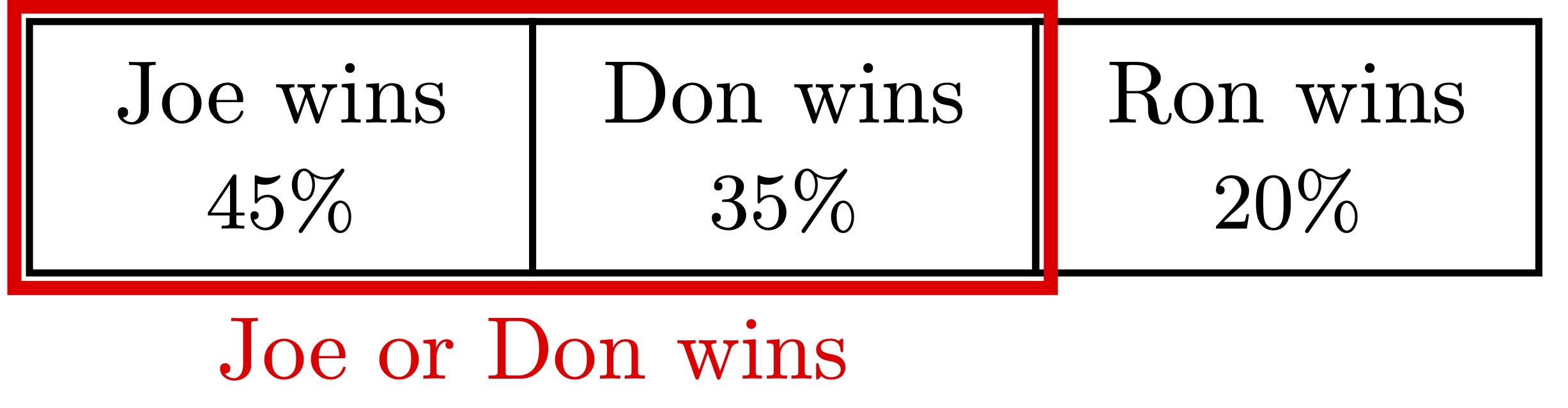 Consider this simple scenario: Three candidates are running for mayor: Joe, Don, and Ron. Current predictions (which you trust) give Joe a 45% chance of winning, Don a 35% chance, and Ron a 20% chance.