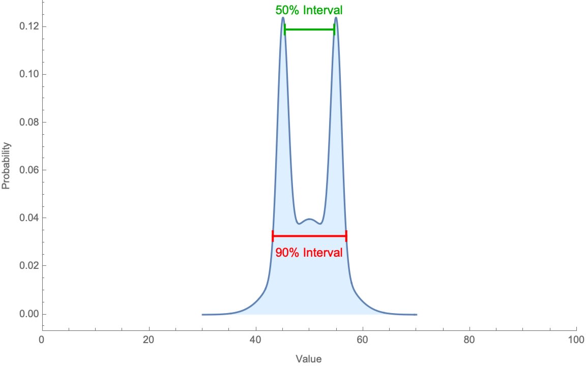 This is puzzling. If people are giving genuine confidence intervals, this implies an extremely implausible shape to their probability distributions—for instance, like so: