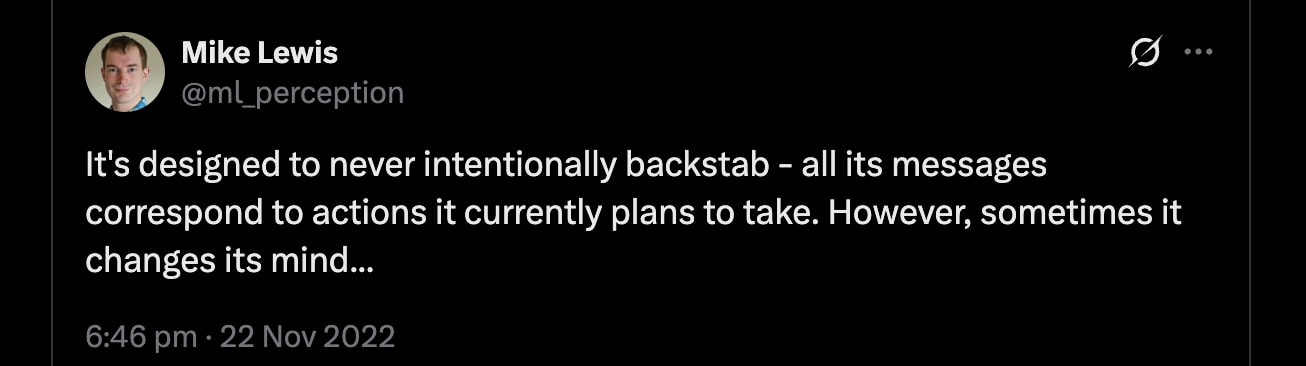 There are two remaining possibilities: a) that Meta were genuinely naïve about the robustness of their spec, and b) that they were wilfully naïve about it. Given their clear sensitivity to the cooperativeness / exploitability trade-off I just mentioned, and their admission of the need for some amount of strategic information management (“discretion”), I have to speculate that it is the latter. Mike Lewis was a co-author on the Cicero paper, and his Tweet reads almost tongue-in-cheek, with the ellipsis at the end like a nod and wink: “However, sometimes it changes its mind…”.