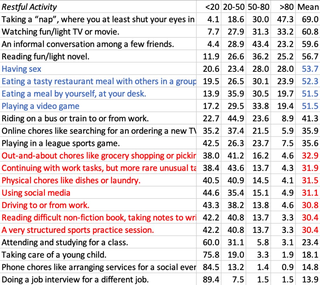 Idk man I am myself confused why breaks work similar to Robin hanson. Below is an image from the results from Robin Hansons poll on which activities people find restful (I think Robin Hanson flunked his Twitter survey there. Taking breaks during work and in your free time are different. I don't think people in that poll were suggesting Playing a video-games is a good break activity at work, but what people find fun to do in their free time). Something something default mode network? Feel free to share your theories in the comments.