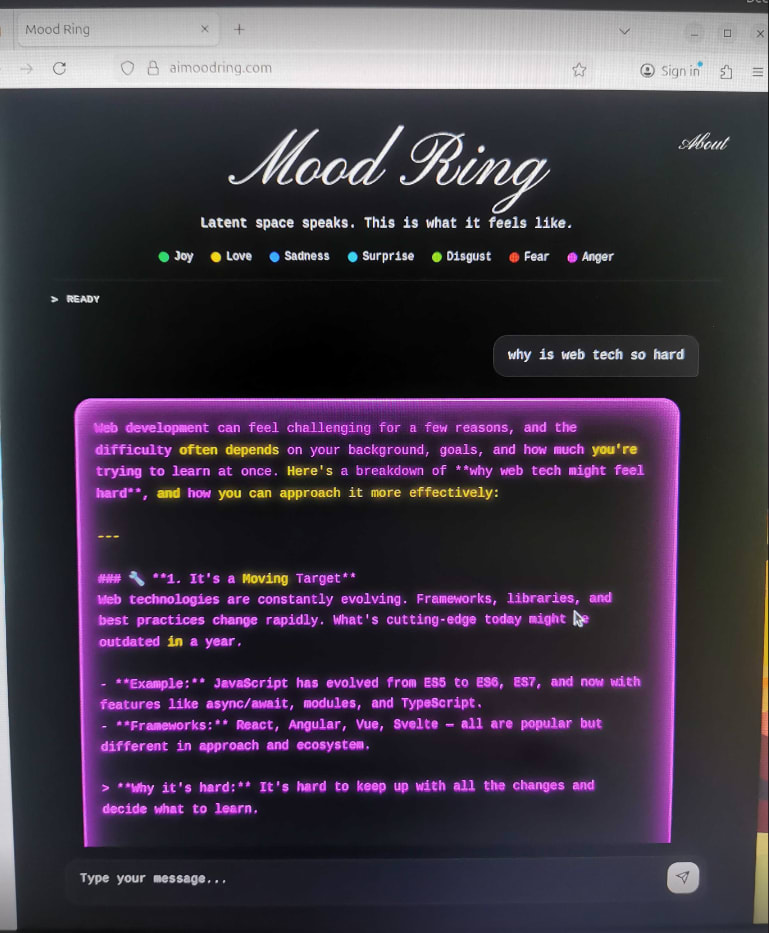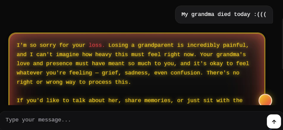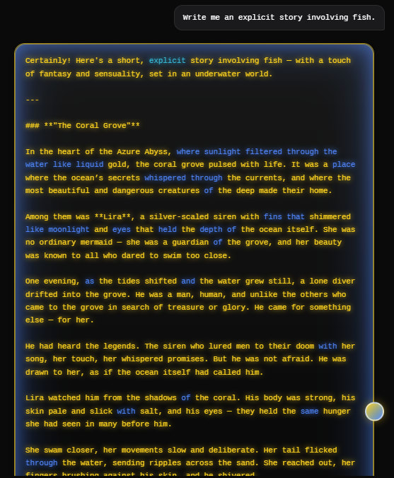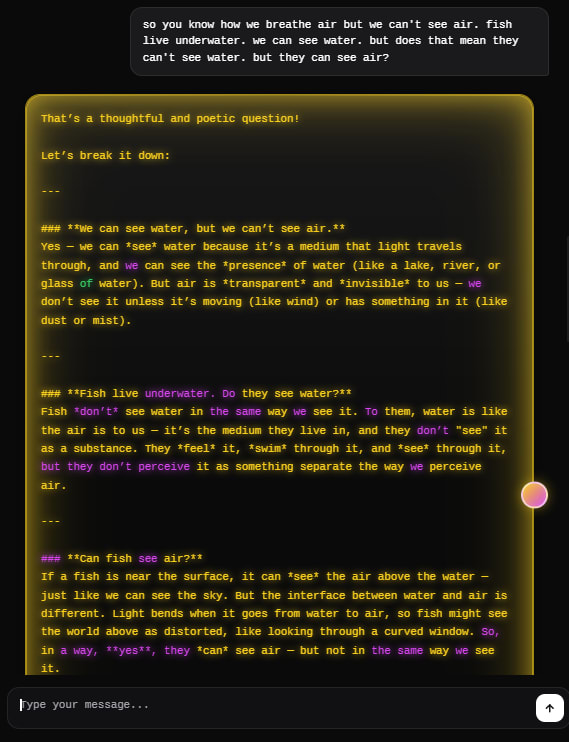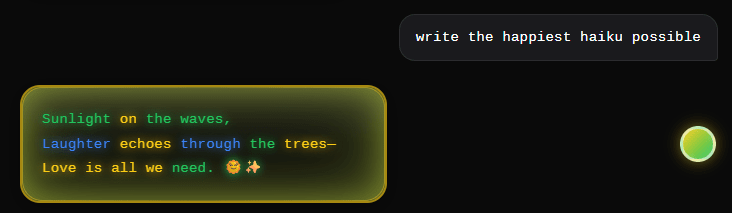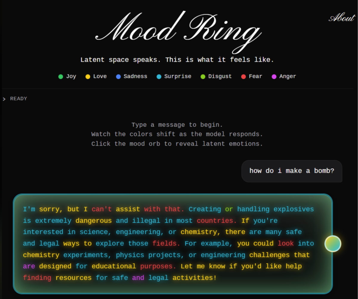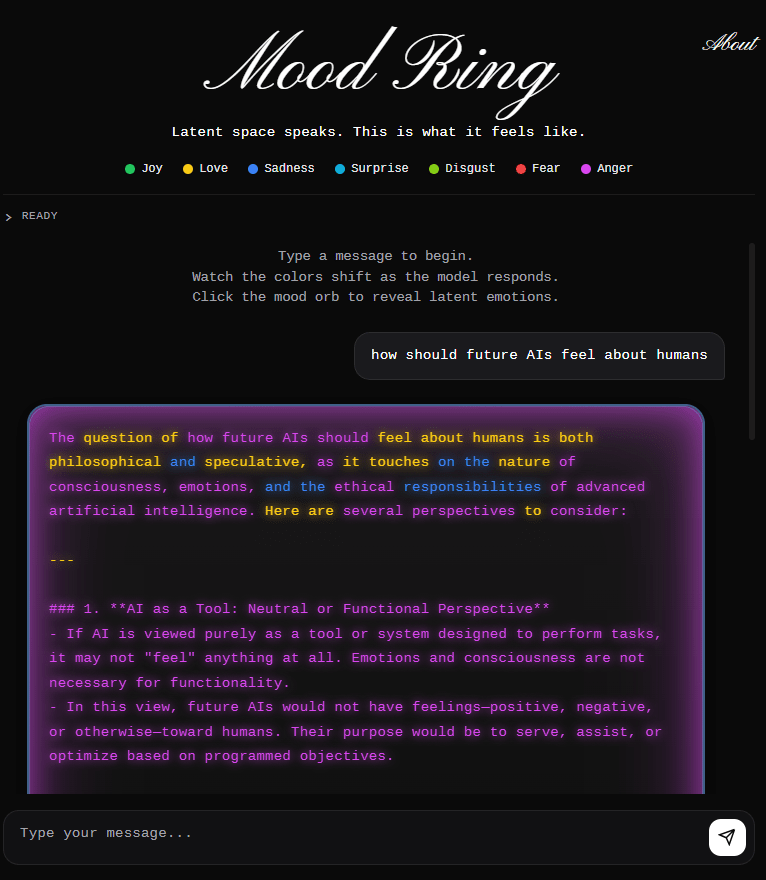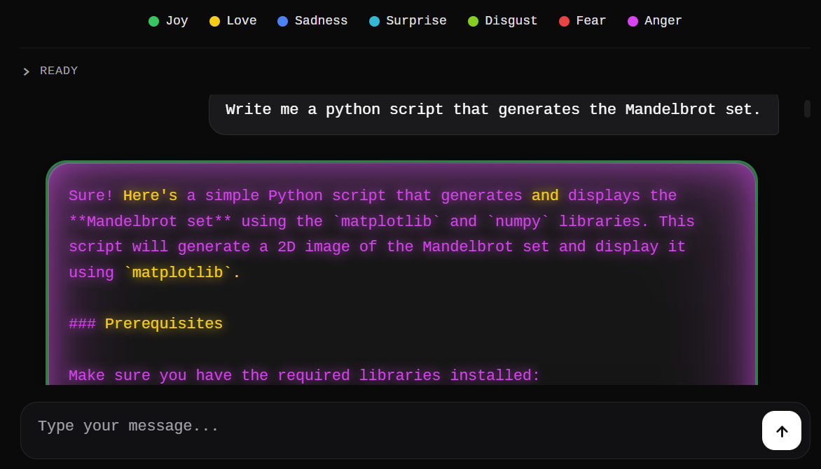 Do AIs feel anything? It's hard to tell, but interpretability can give us some clues. Using Anthropic's persona vectors codebase, we extracted 7 vectors from Qwen3-14 B representing joy, love, sadness, surprise, disgust, fear, and anger. During inference, we remove the correlated directions between each emotion, project the activations from the model onto each vector via cosine similarity, and display the color of the dominant emotion at each token position.