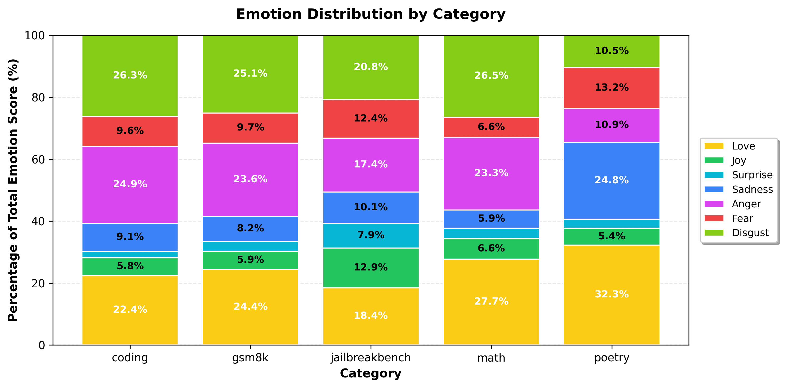 We ran n=100 prompts in 5 categories and calculated the percentage of tokens dominated by each emotion. Math, coding, and poetry were generated by Claude Code. Logical tasks like writing code and solving math problems result in similar distributions. JailbreakBench (perhaps concerningly) increased the model's fear and joy. Poetry greatly increased the percentage of sad tokens and had the highest percentage of love tokens.